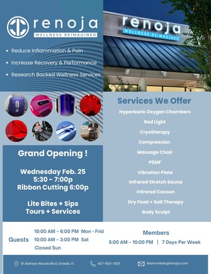 Ribbon Cutting - Renoja Wellness Reimaged Date and Time Wednesday Feb 25, 2026 5:30 PM - 7:00 PM EST Location Wednesday Feb 25th, 5:30PM - 7:00PM 91 Alafaya Woods Blvd, Oviedo, FL 32765 Ribbon Cutting - Renoja Wellness Reim... Set a Reminder Enter your email address below to receive a reminder message. Email address Select the amount of Days before the event -- Select Days Before Event -- 1 Day 2 Days 3 Days 1 Week Captcha Validation Please complete the Captcha Submit Description Join us for the official ribbon cutting of Renoja Wellness Reimagined! Images Gallery Image × Set a Reminder Enter your email address below to receive a reminder message. Email address Select the amount of Days before the event -- Select Days Before Event -- 1 Day 2 Days 3 Days 1 Week Captcha Validation Please complete the Captcha Submit Share × Print Email Add to Calendar Facebook Twitter LinkedIn Tell a Friend × Select Calendar Type × Google Yahoo iCal (Outlook, Apple, or other)