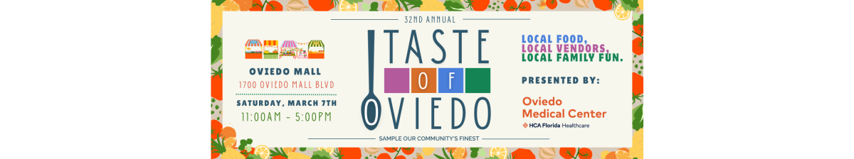 The 32nd Annual Taste of Oviedo, presented by Oviedo Medical Center, will be taking place at Oviedo Mall on Saturday, March 7, 2026, from 11 am - 5 pm! Food, fun and FREE ADMISSION for the whole family! Come enjoy delicious dishes from the best local restaurants and eateries while the kids enjoy entertainment and activities, while enjoying live music!