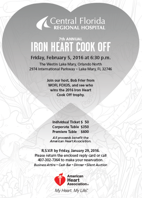 Presented by the Central Florida Regional Hospital, the 7th Annual Iron Heart Cook Off features four physicians competing against each other to see who can prepare the heart-healthiest entrée using secret ingredients. Bob Frier from WOFL FOX35 will host the event.