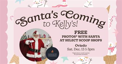 Santa's coming to Kelly's! FREE Photos with Santa at select Scoop Shops. Save the date to join the fun!